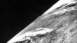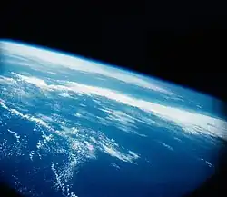Атмосфера перестаёт поглощать космическую радиацию[48]. Яркость неба ок. 5 кд/м²[49][50]. Выше свечение некоторых явлений может намного перекрывать яркость рассеянного света (см. далее). - 40—80 км — максимальная ионизация воздуха (превращение воздуха в плазму) от трения о корпус спускаемого аппарата при входе в атмосферу с первой космической скоростью[51].