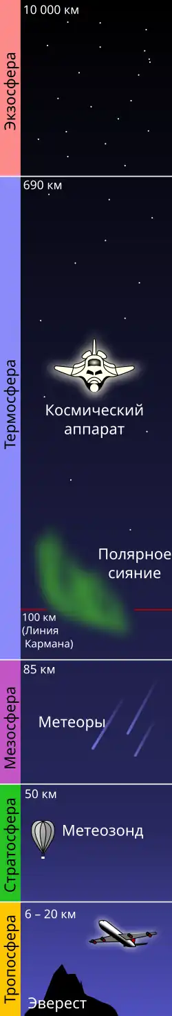 - ↑ Обычные самолёты и аэростаты на эти высоты не поднимаются, ракетопланы, геофизические и метеорологические ракеты слишком быстро тратят топливо и вскоре начинают падение, спутники с круговой орбитой, то есть формально с постоянной высотой, здесь также долго не задерживаются из-за нарастающего сопротивления воздуха, см. далее.