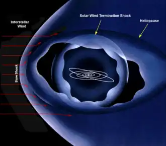 Окружающая Солнце область космического пространства, на которую распространяется солнечный ветер, называется гелиосферой. В пределах гелиосферы находятся орбиты всех известных планет Солнечной системы[9][Комм. 1]. Свободное от крупных плотных тел пространство гелиосферы заполнено так называемой межпланетной средой, а за гелиопаузой начинается область межзвёздной среды.
