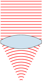 - ↑ Ход лучей показан, как в идеализированной (тонкой) линзе, без указания на преломление на реальной границе раздела сред. Дополнительно показан несколько утрированный образ двояковыпуклой линзы.