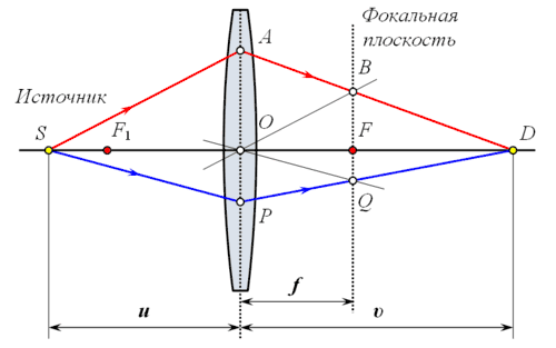 Обозначим расстояние от линзы до источника света через , расстояние от линзы до точки фокусировки лучей через , фокусное расстояние через . Выведем формулу, связывающую эти величины.