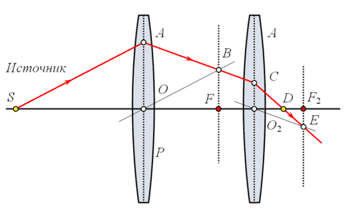 Из точки строим луч , параллельный . При пересечении с фокальной плоскостью второй линзы этот луч даст точку . Согласно второму свойству тонкой линзы луч после прохождения через вторую линзу пойдёт по пути . Пересечение этой линии с оптической осью второй линзы даст точку , где сфокусируются все лучи, вышедшие из источника и прошедшие через обе линзы.