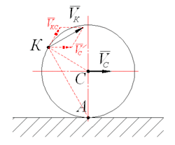 Найдём скорость точки K для колеса, показанного на рисунке 1, если задана скорость центра колеса (точки С), его радиус и угол АСК: