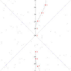 Анимация иллюстрирует возникновение разницы во времени между близнецами в парадоксе близнецов. Чёрная линия — мировая линия неподвижного (или равномерно движущегося) близнеца. Красная линия — мировая линия близнеца, движущегося с ускорением. Наблюдатель находится в системе отсчета, двигающейся вдоль мировой линии ускоряющегося и замедляющегося близнеца. Цифры вдоль линий показывают ход часов обоих близнецов. Часы запускаются одновременно. Когда близнецы снова встречаются, красные часы (движущиеся неравномерно) отстают по сравнению с чёрными (движущимися равномерно). Вертикальное ось соответствует времени, горизонтальная — координата; пунктирная линия — световой конус наблюдателя. Маленькие точки — события в пространстве-времени (например, вспышки света).
