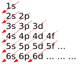 • Электронная конфигурация. Организация электронов демонстрирует определённый повторяющийся периодический образец. Электроны занимают последовательность оболочек, которые идентифицируются числами (оболочка 1, оболочка 2 и т. д.), а те, в свою очередь, состоят из подуровней, определяемых литерами s, p, d, f и g. По мере увеличения атомного числа электроны постепенно заполняют эти оболочки; каждый раз, когда электрон впервые занимает новую оболочку, начинается новый период в таблице. Сходства в электронной конфигурации обусловливают подобие свойств элементов (наблюдение за которыми и привело к открытию периодического закона)[32][33].