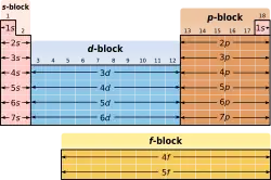 Ввиду значимости внешней электронной оболочки атома различные области периодической таблицы иногда описываются как блоки, именуемые в соответствии с тем, на какой оболочке находится последний электрон[30]. S-блок включает первые две группы, то есть щелочные и щёлочноземельные металлы, а также водород и гелий; p-блок состоит из последних шести групп (с 13-й по 18-ю, согласно стандарту именования ИЮПАК, или с IIIA до VIIIA — по американской системе) и включает, помимо других элементов, все металлоиды. D-блок — это группы с 3-й по 12-ю (ИЮПАК), они же — с IIIB до IIB (американская система), в которые входят все переходные металлы. F-блок, выносимый обычно за пределы таблицы, состоит из лантаноидов и актиноидов[31].