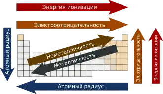 В рамках периода элементы демонстрируют определённые закономерности во всех трёх названных выше аспектах (атомный радиус, энергия ионизации и электроотрицательность), а также в энергии сродства к электрону. В направлении «слева направо» атомный радиус обычно сокращается (в силу того, что у каждого последующего элемента увеличивается количество заряженных частиц, и электроны притягиваются ближе к ядру[28]), и параллельно с ним возрастает энергия ионизации (чем сильнее связь в атоме, тем больше энергии требуется на изъятие электрона). Соответствующим образом увеличивается и электроотрицательность[25]. Что касается энергии сродства к электрону, то металлы в левой части таблицы характеризуются меньшим значением этого показателя, а неметаллы в правой, соответственно, большим — за исключением благородных газов[29].