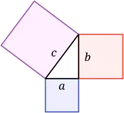 Античные авторы нашей эры[83] отдают Пифагору авторство известной теоремы: квадрат гипотенузы прямоугольного треугольника равняется сумме квадратов катетов. По всей видимости то, что мы называем «теоремой Пифагора», было известно до Пифагора. Античному математику приписывают её доказательство в общем виде. Первоначально «теорема Пифагора» устанавливала соотношение между площадями квадратов, построенных на гипотенузе и катетах прямоугольного треугольника, а именно «квадрат, построенный на гипотенузе, равновелик сумме квадратов, построенных на катетах»[84]. Тройки натуральных чисел, для которых выполняется диофантово уравнение , получили название пифагоровых (3, 4, 5; 5, 12, 13 и т. д.)[85]. Согласно описанной у Диогена Лаэртского, с отсылкой к Аполлодору, легенде, в день, когда Пифагор открыл свою теорему, он принёс богам гекатомбу (100 быков)[86].