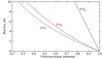 Эти три формулы (зависимость температуры, давления и плотности от высоты) и использованы для построения графиков, приведенных справа. Графики нормализованы — показывают общий вид поведения параметров. «Нулевые» значения для верных вычислений нужно каждый раз подставлять в соответствии с показаниями соответствующих приборов (термометра и барометра) на данный момент на уровне моря.