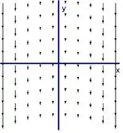 Мы можем не увидеть никакого вращения, но, посмотрев повнимательнее направо, мы видим большее поле в, например, точке , чем в точке . Если бы мы установили маленькое колесо с лопастями там, больший поток на правой стороне заставил бы колесо вращаться по часовой стрелке, что соответствует ввинчиванию в направлении . Если бы мы расположили колесо в левой части поля, больший поток на его левой стороне заставил бы колесо вращаться против часовой стрелки, что соответствует ввинчиванию в направлении . Проверим нашу догадку с помощью вычисления:
