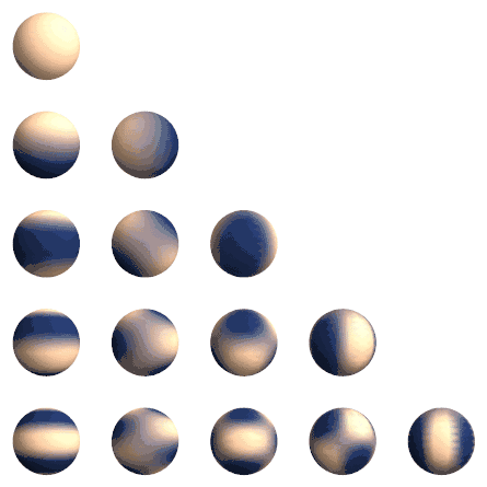Вещественные сферические функции Ylm, l=0…4 (сверху вниз), m=0…4 (слева направо). Функции отрицательного порядка Yl-m повёрнуты вокруг оси Z на 90/m градусов относительно функций положительного порядка.