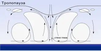 Стеной глаза называют кольцо плотных грозовых кучевых облаков, окружающих глаз.[11] Здесь облака достигают наибольшей высоты в пределах циклона (до 15 км над уровнем моря), а осадки и ветры у поверхности сильнейшие. Однако максимальная скорость ветров достигается на небольшой высоте над поверхностью воды/суши (обычно около 300 м)[2]. Именно прохождение стены глаза над определённым районом вызывает наибольшие разрушения[3].