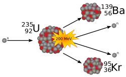 В 1938 году немецкие физики Отто Ган и Фриц Штрассман открыли непредсказанное явление, происходящее с ядром урана при облучении его нейтронами. Захватывая свободный нейтрон, ядро изотопа урана 235U делится, при этом выделяется (в расчёте на одно ядро урана) достаточно большая энергия, в основном в виде кинетической энергии осколков и излучения. Позднее теория этого явления была обоснована Лизой Мейтнер и Отто Фришем и независимо от них Готтфридом фон Дросте и Зигфридом Флюгге[9]. Данное открытие явилось истоком как мирного, так и военного использования внутриатомной энергии.