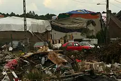 Поднимает автомобили в воздух. Мобильные дома поднимаются в воздух или разрушаются, навесы отброшены на значительные расстояния. С некоторых домов полностью сорваны крыши, балки крыш более прочных домов полностью обнажены, концы фронтонов оторваны. Многие деревья вырваны с корнем или сломаны. |