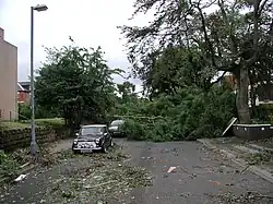 Шезлонги, маленькие растения, тяжёлый мусор разносятся по воздуху; незначительные повреждения навесов. Более серьёзные повреждения черепицы, шифера и дымоходов. Деревянные заборы повалены. Незначительные повреждения живых изгородей и деревьев. |