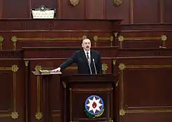 Унитарное государство[24], президентская республика. С 1993 года власть в стране удерживает политическая династия Алиевых и подконтрольная им партия «Новый Азербайджан», правление которых характеризуется исследователями как авторитарный режим[8][9][10]. В 2003 году после смерти отца, Гейдара Алиева, пост президента занял Ильхам Алиев.
