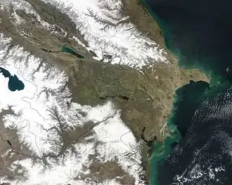 Около половины территории Азербайджана занято горами. На севере — хребет Кавказа, в средней части — Кура-Аракская низменность, на юго-востоке — Талышские горы и Ленкоранская низменность, на западе — Армянское нагорье[48].