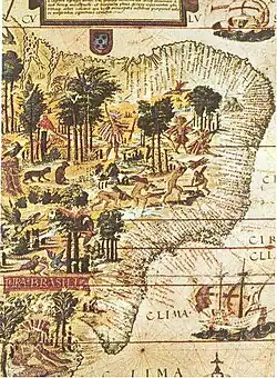 Это название, по одной из версий, связано с открытием на побережье деревьев цезальпинии ежовой, древесину которых стали в большом количестве вывозить в Европу. Португальцы называли это дерево пау-бразил (порт. pau-brasil — дерево бразил): они считали, что нашли место, откуда арабские торговцы брали так называемый бразил (порт. brasil, от порт. brasa — «жар», «раскалённые угли») — ценную красную древесину, которая попадала в Европу уже с XII века и использовалась для приготовления красок, а также для изготовления мебели и музыкальных инструментов (в действительности арабы поставляли в Европу древесину родственного, но иного растения, растущего в Юго-Восточной Азии).
