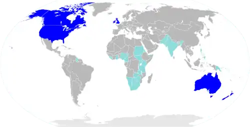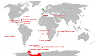 Соседние острова Мэн, Гернси и Джерси формально не входят в Соединённое Королевство, имея статус владений короны; британское правительство отвечает за их оборону и международное представительство[30]. Кроме того, сохраняется 14 британских заморских территорий, последние реликты Британской империи[31], которая на пике своего территориального расширения в 1920-е годы охватывала почти четверть суши и треть населения мира, став крупнейшей империей в истории[32]. Британское влияние наблюдается в языке, культуре, правовых и политических системах многих бывших колоний страны[33][34].