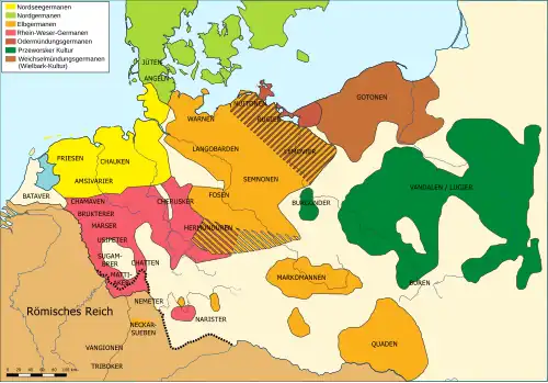 Первые упоминания о древних германцах появились в трудах древних греков и римлян. Одно из первых упоминаний о германцах относится к 98 году. Оно было сделано римским летописцем Тацитом (лат. Tacitus). Вся территория современной Германии к востоку от Эльбы (славянской Лабы) до X века была заселена славянскими племенами[33]. (см. подробнее: полабские славяне). К XII—XIV векам эти земли постепенно вошли в состав тех или иных немецких государственных образований, составлявших так называемую Священную Римскую Империю. По мере пребывания этих территорий в составе немецких государств за несколько столетий местные славяне постепенно практически полностью были ассимилированы немцами. Этот процесс растянулся до позднего Средневековья и начала нового времени, а местами, с последним, ещё не до конца ассимилированным славянским народом Германии — лужичанами, длится до сих пор.