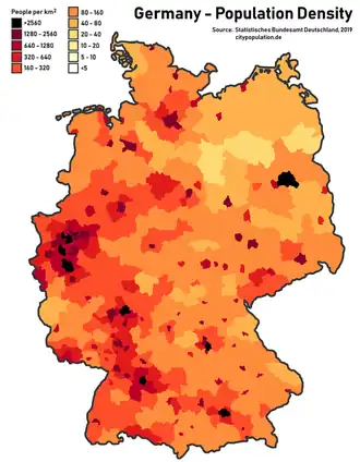 | Крупнейшие города | Берлин, Гамбург, Мюнхен, Кёльн, Франкфурт-на-Майне, Штутгарт, Дюссельдорф, Лейпциг, Дортмунд, Эссен[2] | ||||