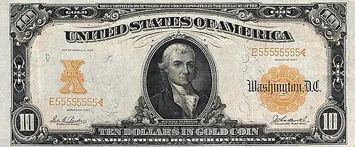 В 1900 году был принят закон о золотом стандарте, который положил конец биметаллизму и утвердил золото в качестве единственного денежного металла. Содержание чистого золота в долларе устанавливалось на уровне 1,50463 грамма[13][16]. В 1913 году была создана Федеральная резервная система, которая получила право эмитировать банкноты, подлежавшие обмену на золотые монеты[14].