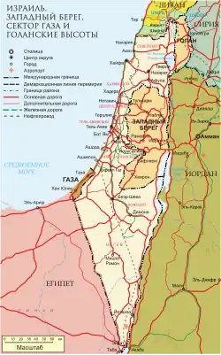 ![]() Светло-зелёным выделены территории, согласно СБ ООН оккупированные Израилем: Голанские высоты, Западный берег реки Иордан, а также Сектор Газа |