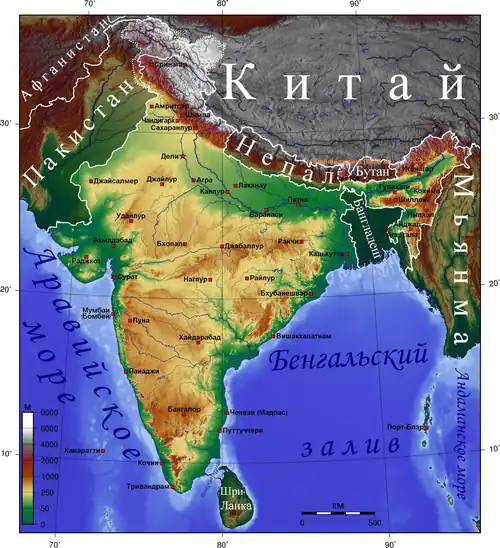 Индия граничит с Пакистаном на западе, с Китаем, Непалом и Бутаном на северо-востоке, с Бангладеш и Мьянмой — на востоке. Кроме того, имеет морские границы с Мальдивами на юго-западе, со Шри-Ланкой на юге и с Индонезией на юго-востоке[8]. Спорная территория Ладакх имеет границу с Афганистаном[a].