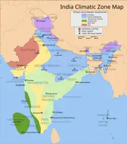 На климат Индии оказывают сильное влияние Гималаи и пустыня Тар, вызывая муссоны[21]. Гималаи служат преградой холодным центрально-азиатским ветрам, таким образом делая климат на большей части Индии теплее чем в соседних Южном Китае и Мьянме[22][23]. Пустыня Тар играет ключевую роль в привлечении влажных юго-западных ветров летнего муссона, которые в период с июня по октябрь обеспечивают большую часть Индии дождём[21]. В Индии преобладают четыре основных климата: влажный тропический, сухой тропический, субтропический муссонный и высокогорный[24].
