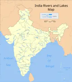 Самые крупные реки, берущие своё начало в Гималаях и большей своей частью протекающие по территории Индии, это Ганг и Брахмапутра; обе они впадают в Бенгальский залив[16]. Главные притоки Ганги это Ямуна и Коши. Их низкие берега каждый год становятся причиной катастрофических наводнений. Другие важные реки Индостана, это Годавари, Маханади, Кавери и Кришна, также впадающие в Бенгальский залив[17], и Нармада и Тапти, впадающие в Аравийское море[18] — крутой берег этих рек не даёт их водам разливаться. Многие из них имеют важное значение как источники орошения. Значительных озёр в Индии нет.