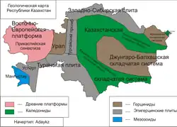 На западе страны расположена часть Восточно-Европейской платформы, на юго-западе — складчатые сооружения Альпийского пояса, а в остальной части складчатые сооружения и эпигерцинские плиты Урало-Монгольского пояса, из-за этого часты землетрясения (см. Кеминское землетрясение, землетрясения в Алма-Ате). Частью Восточно-Европейской платформы в Казахстане является Прикаспийская синеклиза.