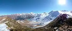 От южной до восточной части Казахстана вдоль границ с Кыргызстаном и Китаем протягиваются хребты северной окраины Тянь-Шаня, достигая на стыке границ Казахстана, Кыргызстана и Китая почти 7 тыс. м над уровнем моря (пик Хан-Тенгри, 6995 м). На юго-востоке страны расположены хребты Джунгарский Алатау и Заилийский Алатау, у подножья Заилийского Алатау находится бывшая столица Казахстана и крупнейший город страны — Алма-Ата.