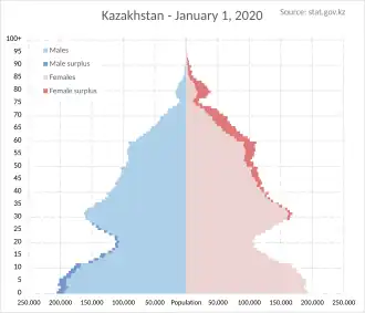 Казахстан — многонациональное государство с широким этнокультурным, языковым, религиозным, расовым и национальным многообразием. Согласно кратким итогам переписи 2021 года, опубликованным 1 сентября 2022 года[15] в стране проживает: казахов — 13 497 891 чел. (70,4 % населения), русских — 2 981 946 (15,5 %), узбеков — 614 047 (3,2 %), украинцев — 387 327 (2,0 %), уйгур — 290 337 (1,5 %), немцев — 226 092 (1,2 %), татар — 218 653 (1,1 %), других этносов и не указавших национальность — 969 722 (5,1 %).