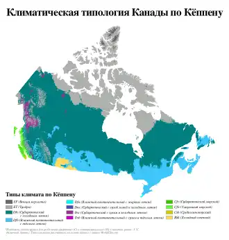 Территория Канады разделена между арктическим, субарктическим и умеренным климатическими поясами. Ярко выражена сезонность, развита циклоническая деятельность, выражающаяся в резкой смене погоды[19]. В северной части страны климат напоминает Скандинавию с её холодной зимой и коротким прохладным летом. В центральных степных регионах очень холодная зима сочетается с жарким летом и малым объёмом осадков. Юг Онтарио и Квебека отличают холодные снежные зимы и жаркое, влажное лето. Климат в приморских регионах на востоке и западе смягчают тёплые течения — Гольфстрим и Аляскинское соответственно, а у побережья Ньюфаундленда и Лабрадора, где Гольфстрим встречается с холодным Лабрадорским течением, результатом становятся более низкие температуры и частые туманы[24]. Глубоко вдающийся в сушу Гудзонов залив приводит к проникновению в восточные регионы арктических воздушных масс и в среднем более низким температурам, чем на западе[19].