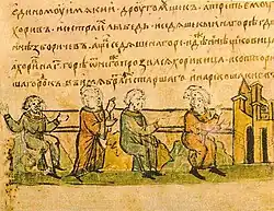 …аще бо бꙑ перевозникъ Кии · то не бꙑ ходилъ Ц͠рюгороду но се Кии кнѧжаше в родѣ своємь · и приходившю єму ко ц͠рю . ꙗкоже сказають · ꙗко велику честь приꙗлъ есть ѿ ц͠рѧ · при которомь приходивъ ц͠ри · идущю же єму ѡпѧть · приде къ Дунаєви . и възлюби мѣсто и сруби градокъ малъ и хотѧше сѣсти с родомъ своимъ и не даша єму ту блїзь живущии · єже и донꙑнѣ наречють Дуици городище Киевець · Киеви же пришедшю въ свои градъ Києвъ · ту животъ свои сконча · а братъ єго Щекъ и Хоривъ и сестра ихъ Лꙑбедь ту скончашасѧ…