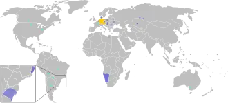 Немецкий язык широко распространён во всём мире как родной и как второй[19][20]. Помимо основных трёх немецкоговорящих стран Западной Европы, среди которых — Германия, Швейцария и Австрия, немецкий язык находит применение в других государствах, попадая в категорию местных языков меньшинств[21][22]. Так, немецкий является родным языком или языком общения для лиц немецкого происхождения в странах Центральной и Восточной Европы[23], для более чем двух миллионов человек в США, Канаде и Бразилии, широко используется в Австралии и в некоторых постколониальных странах Африки[24]. При этом немецкий язык является одним из официальных языков Европейского союза[13] и многих других международных и региональных организаций.