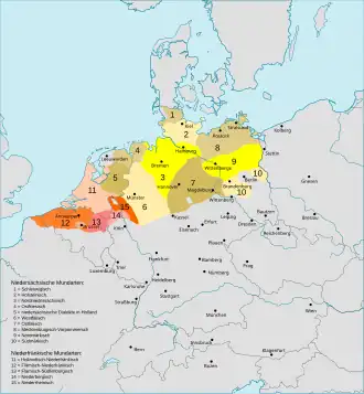 Нижненемецкая группа диалектов (Niederdeutsch, Plattdeutsch) распространена на севере Германии и в восточной части Нидерландов. Нижнефранкские диалекты на территории Нидерландов обычно выделяют как диалекты нидерландского языка[62], однако их историческая связь с немецким языком не позволяет рассматривать их в разрыве друг от друга[63]. В списке приведены все крупные диалекты этой группы без различения области их распространения. Нижнесаксонские, также называемые западнонижненемецкими, и восточнонижненемецкие диалекты объединяют понятием нижненемецкий язык. Западные диалекты этого языка отличаются от восточных прежде всего исторически сложившимися фонетическими нормами и лексикой, так как диалекты северо-восточной Германии в Средние века были подвержены влиянию славянских языков. Некоторые диалекты восточнонижненемецкого пространства пересекаются с восточносредненемецкими диалектами[64]