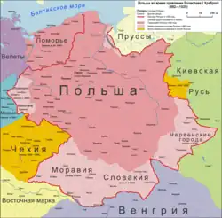 В 999 году Болеслав отнимает у Чехии будущую Малую Польшу с Краковом; он был чешским князем с 1003 по 1004 год, после длительной войны со Священной Римской империей присоединил Лужицы и Мильско. Болеслав породнился с киевским князем Святополком Окаянным и, поддерживая его против брата Ярослава Мудрого, в 1018 году занял Киев; в 1025 году он принял титул короля. Его сын Мешко II Вялый, вынужденный воевать одновременно с Германией, Чехией и Русью, потерял почти все завоевания своего отца, включая и королевский титул, от которого он отказался в 1033 году. После его смерти начался период хаоса и анархии, и его сын Казимир I Восстановитель, изгнанный из Польши мятежниками, с трудом и потерями восстановил свою власть. Зато сын последнего Болеслав II Смелый (1058—1079) полностью возродил былое могущество Польши и вновь (1076) принял королевский титул; в 1068 году он, поддерживая своего родственника Изяслава Ярославича, также овладел Киевом. Он был свергнут в результате заговора; но при Болеславе III Кривоустом (1102—1138) Древнепольское государство достигло последнего расцвета. Болеслав в 1109 году отразил нашествие немецкого императора, в 1122 году присоединил к Польше практически всё Поморье. Однако после его смерти, как в те же годы на Руси — после смерти Владимира Мономаха, в Польше началась феодальная раздроблённость. Согласно «Статуту Болеслава Кривоустого» (1138), Польша была разделена между четырьмя сыновьями с титулом великого князя и великокняжеским уделом (часть Великой Польши с Гнезном и Малая Польша с Краковом) за старшим. Образовался ряд княжеств: Куявия, Мазовия, Силезия, Поморье, Сандомир и т. д.