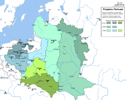 Во времена правления Екатерины Великой Россия совместно с Пруссией и Австрией осуществила три раздела Речи Посполитой, в результате которых к Российской империи присоединены Белоруссия, Литва, Инфлянты, Волынь и Подолия. Также она успешно вела войны с Турцией за выход к Чёрному морю и присоединила Крым (1783 г.). Старейшины Ингушетии заключили договор (1770 г.) о принятии Ингушетии в российское подданство и переходе под российское покровительство[38]; в 1783 году Восточная Грузия, ведущая постоянные войны с турками и персами, находящаяся под угрозой полного уничтожения и частично оккупированная Османской империей попросила защиты у христианской России, подписала Георгиевский трактат и добровольно вошла[39] в состав Российской империи на правах протектората, что обеспечило мир на её территории и в дальнейшем способствовало отмене крепостного права; в 1801 году Восточная Грузия стала российской губернией. В результате русско-турецких войн к 1872 году вся территория современной Грузии, а также Абхазия вошли в состав России.