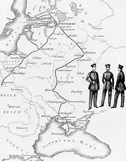Россия потерпела поражение в Крымской войне (1853—1856 гг.)[53] с Турцией и поддержавшими последнюю Великобританией и Францией, обеспокоенными усилением России на международной арене и обладавшими в своей совокупности существенным военно-техническим превосходством[54]. По результатам Крымской войны был заключён Парижский мирный договор, согласно которому Россия согласилась на минимальные территориальные уступки, но теряла право иметь военные базы и военный флот в Чёрном море, также как и Турция. В 1870 году Россия отказалась[55] выполнять статьи Парижского мирного договора и была заключена Лондонская конвенция (1871), разрешающая иметь России и Турции военно-морской флот и военные базы на Чёрном море. Утраченные территории и право защищать христианское население Турции Россия вернула в 1878 году на основе подписанного канцлером Александром Горчаковым и графом Петром Шуваловым Берлинского трактата, в результате которого к России перешла Карсская область и была возвращена Южная Бессарабия[56].