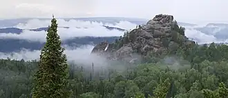 Южная и восточная части страны преимущественно гористые. На крайнем юге Европейской части тянутся северные хребты Большого Кавказа: здесь находится самая высокая вершина России — Эльбрус (5642 м над уровнем моря)[51]. На юге Сибири — Алтай, Западный и Восточный Саяны, Становое нагорье и другие горные системы. Северо-восток Сибири и Дальний Восток — регионы преобладания средневысотных горных хребтов, таких как Сихотэ-Алинь, Верхоянский, Черского и т. д. Полуостров Камчатка [здесь находится самый высокий вулкан Евразии — Ключевская Сопка (4688 м над уровнем моря)][52] и Курильские острова на крайнем востоке — территория вулканов. Здесь их насчитывается более 200, причём около 50 из них — действующие.