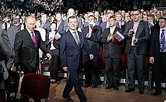 Россия — федеративная президентско-парламентская республика[5]. С 31 декабря 1999 года (с перерывом в 2008—2012 годах, когда президентом был Дмитрий Медведев) должность президента России занимает Владимир Путин. C 16 января 2020 года в должности председателя правительства находится Михаил Мишустин. За годы правления Путина политический режим России сменился с демократического[28] на авторитарную диктатуру[29][30].