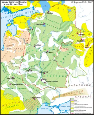 Скандинавские археологические древности свидетельствуют о большой миграционной волне из Скандинавии в Восточную Европу, в основном с территории Средней Швеции[135]. Скандинавы появляются на территории севера Восточной Европы не позднее середины VIII века[136]. К середине IX века или около этого времени в результате развития договорных и даннических отношений между народом «русь» и местными славянскими и финскими племенами (что, предположительно, отражено в летописном сказании о призвании варягов во главе с Рюриком в 862 году) на севере Восточной Европы (на месте гипотетической Северной конфедерации племён[137]) возникает раннегосударственное образование (отождествляемое с летописным государством Рюрика)[138]. В 882 году князь Олег объединяет северные территории и Киев, и формируется «путь из варяг в греки» — торговый путь из Скандинавии через Восточную Европу в Византию[136]. В течение X века социальная элита Древнерусского государства, первоначально представленная преимущественно народом «русь», включала в свой состав всё большее число славян и представителей других этносов, в результате чего понятие «русь» приобрело социальное значение и стало обозначать высшую социальную группу, а народ «русь» ассимилировался окружающим населением и вошёл в состав сформировавшейся древнерусской народности[69].