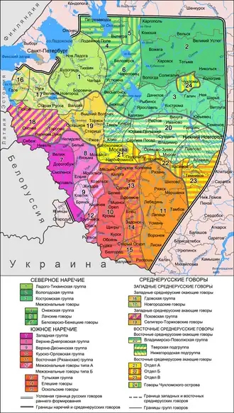 Диалекты русского языка группируются в два наречия: северное и южное. Между наречиями локализуются переходные среднерусские говоры, ставшие основой современного литературного языка[12].