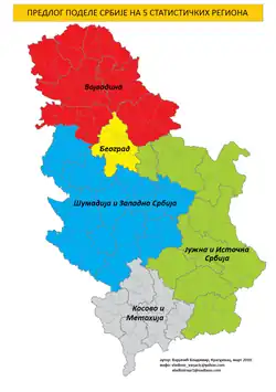 Согласно Конституции Сербии, в её составе находятся два автономных края: Воеводина, а также Косово и Метохия[8]. Косово с 1999 года, согласно резолюции СБ ООН 1244, находится под протекторатом ООН и властями Сербии не контролируется. Институты временного местного самоуправления, в которых косовские албанцы составляют большинство, односторонне провозгласили независимость края 17 февраля 2008 года, а независимость частично признанной Республики Косово признаётся 101 государством — членом ООН.
