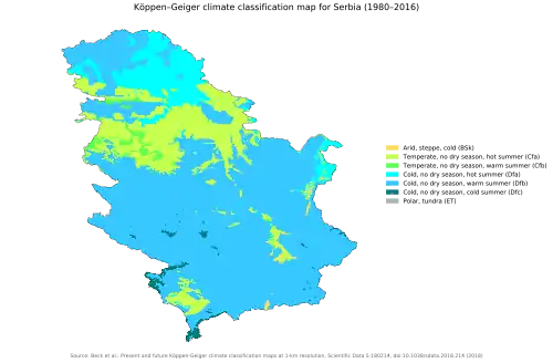 В Сербии преобладает умеренно-континентальный климат с более или менее выраженными характеристиками в зависимости от местоположения, рельефа, наличия или отсутствия рек, растительности или степени урбанизации. Север страны характеризуется континентальным климатом с холодной зимой и жарким влажным летом, на который влияют воздушные массы из северной и западной Европы. В то же время в южных районах страны, ближе к Адриатическому морю, лето жаркое и сухое, а осень и зима относительно холодные, сопровождающиеся обильными снегопадами, поскольку эти области находятся под влиянием Средиземного моря. Данное влияние несколько ограничено Динарскими Альпами и другими горными хребтами, которые помогают охлаждать массы горячего воздуха.