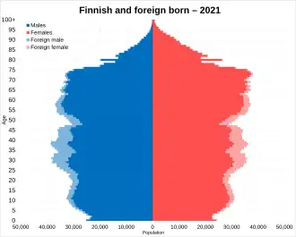 Финляндия, по состоянию на 1 марта 2023 года, — относительно малонаселённая страна с населением в 5 568 637 человек[10], сосредоточенным в основном в южных и центральных частях страны. Конституция Финляндии определяет финский и шведский языки как национальные языки. В конце 2022 года говорящие на финском языке составляли 85,9 % населения (4 778 891 чел.), говорящие на шведском языке — 5,2 % населения (287 052 чел.), а говорящие на саамских языках — 0,04 % населения (2035 чел.)[11]. Говорящие на других языках составляли 8,9 % (495 992 чел.) населения[11].