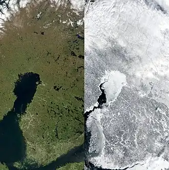 Финляндия имеет умеренный климат, переходный от морского к континентальному, в зависимости от случайного направления воздушных потоков. Расположение к юго-востоку от Гольфстрима влияет на климат Финляндии и повышает температуру финской зимы — она выше по сравнению с другими регионами той же широтной зоны. Повышение температуры из-за Гольфстрима составляет около 6-11 °C[26].
