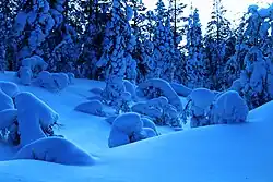 - Северные верховья, большая часть которых расположена за Северным полярным кругом. Отличаются довольно бедными почвами. Для Лапландии также характерны скалистые горы и небольшие возвышенности. Там же, в западной части Лапландии, находится высшая точка Финляндии (1324 метра над уровнем моря) — она расположена на склоне сопки Халти. Вопреки распространённому заблуждению, эта точка не является вершиной сопки (вершина Халти имеет высоту 1365 м и находится на территории Норвегии). Ранее в справочниках в качестве самой высокой точки Финляндии указывалась величина 1328 м; позже было определено, что склон Халти, имеющий такую высоту, тоже находится на территории Норвегии, высшая же точка на финском склоне находится на высоте 1324 м[21].
