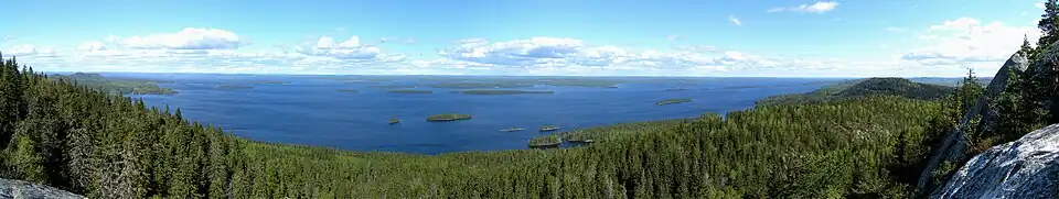 При продвижении с юга Финляндии на север ландшафты морского побережья с огромным числом мелких островов и скал сменяются густыми хвойными (большей частью сосновыми) лесами, покрывающими центральную часть страны. Общая площадь лесов составляет 20 млн гектаров[54] (около 60 % территории страны). Леса богаты черникой[55], малиной, брусникой, клюквой, а также грибами — белыми, боровиками[56], подосиновиками, лисичками, вороночниками рожковидными и другими[57]. Отдельные годы бывают урожайными для гриба мацутакэ[58]. На севере находятся почти лишённые древесной растительности сопки Лапландии, поросшие зарослями морошки[59]. В связи с потеплением климата, на юге Финляндии всё большее распространение получают как местные широколиственные породы (клён, липа, дуб), так и интродуценты в некоторых случаях. К примеру, есть вероятность более широкого расселения бука в прибрежных районах южной Финляндии[60].